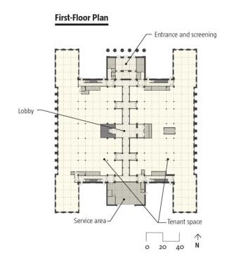 While Greek forms are typical of many federal buildings from the early years of our Republic, there are some practical reasons for choosing Greek over Roman precedents in this particular building. “The rigid modularity of Greek Classicism lends itself to modern space planning,” Lasher says. “And GSA allocations are very precise.” To accommodate these considerations, the building is based on a 60-centimeter grid—the metric equivalent of a 2-foot module.