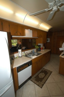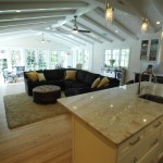 The existing 162 square foot kitchen was dark! Design challenges included dark paneled walls, a low ceiling, small openings to adjacent rooms and fluorescent lighting all contributing to a dreary feeling. To further complicate matters, there was no way to add onto the kitchen from the exterior of the house – any enlargement of the kitchen would come at the cost of existing space.