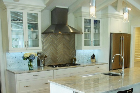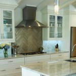 In order to create the unified open plan the clients wanted and create more kitchen space, interior walls were removed and the ceiling reworked. The ceiling of the adjacent, equally dark family room had interesting beam details that were lost in the great expanse of paneling. When the wall separating the kitchen from the family room was removed, the beam detail was added to the remodeled kitchen space and painted white to draw ones eye up and create a greater sense of space. The adjacent laundry room was also reworked in order to gain additional square footage for the kitchen. New low-e coated windows were installed to provide as much natural light as possible while also being energy efficient. The new kitchen is now 250 square feet with abundant counter space, natural light and storage. New stainless steel appliances, white Shaker-style cabinets, modern mosaic and metallic backsplashes, and granite counters complete the update.