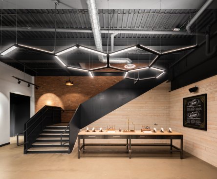 Located in the small town of Smiths Falls, Ontario, this project consists of a development for a cannabis interpretation centre in the former Hershey building. A fascinating and interactive way to learn about cannibis and its history from the inside out, the Tweed Visitor Centre includes a boutique, a café-lounge and a small cafeteria. A mezzanine overlooks grow rooms and products derived from cannabis.