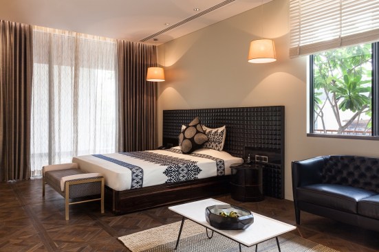 The use of stone, as flooring and wall paneling, juxtaposes contemporary interpretations of traditional techniques. Gwalior mint sandstone wall panels have been fluted and shot hammered while black and white marble inlay on walls and as flooring in the circulation areasvary from bold to simpler geometrical patterns as one moves from lower to upper levels. Sleek elements such as brass detailing and metal skirtingaccentuate the spaces.