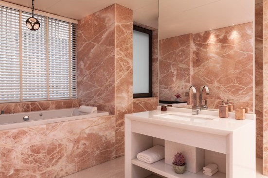 The subtle material palette, while continued in the interiors, is infused with luxury through craftsmanship and contrasted withstrong patterns. A combination of stone, timber and metal create an ambience of understated opulence.