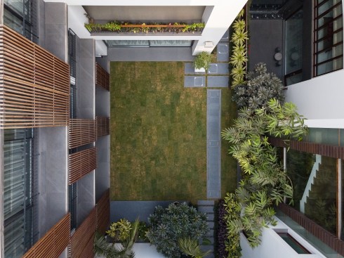 While both buildings remain distinct with individual access and layouts, these have been linked by bridges to connect the spaces and create shared areas such as an urban roof garden. This with the dense bamboo plantation at the outer ground level softens the edges of the buildings.