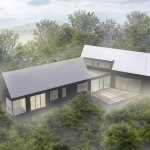 The exteriors of both volumes are clad in a vertical metal rainscreen that meets a zero-eave roof line and concealed gutter channel. Where the exterior wrapper is carved away to create a lookout porch at the living volume, and a master deck at the sleeping volume, the exteriors are clad in vertical wood.