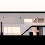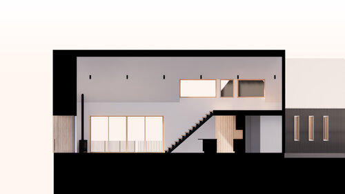 The interiors of both volumes have concrete floors with an earth-tone color admixture. A large 4-panel sliding door opens to the sunset deck so that the deck is its own outdoor room —at once a part of the living room, and at the same time part of the entry vestibule which also serves as a yoga space. An upper loft for the clients’ young children above the kitchen and utility rooms is a place where they can have sleepovers with friends. The open layout and height of the living volume is a contrast to the intimate spaces of the bedrooms down the hall.