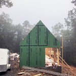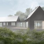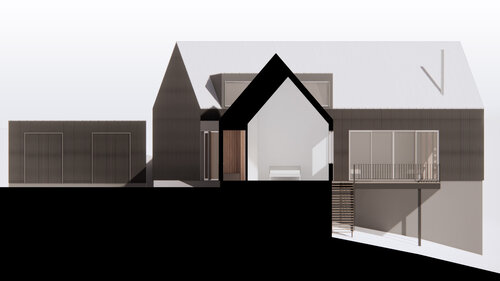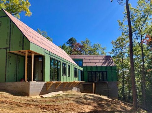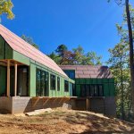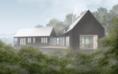 Two Gables is conceived as a modern cabin getaway for a family who lives at Folly Beach. The architectural concept is a gabled living volume and a gabled sleeping volume, which are separated from each other and turned at an angle to create an inside-outside space between them, that open up a panoramic view to the mountains. When asked in initial conversations about what is the center of the home, the client said, “sitting in a space outside at night,” and so the design revolves around this idea.