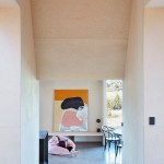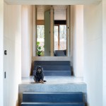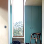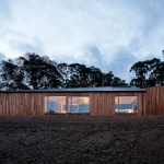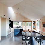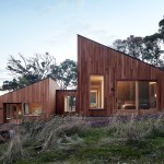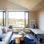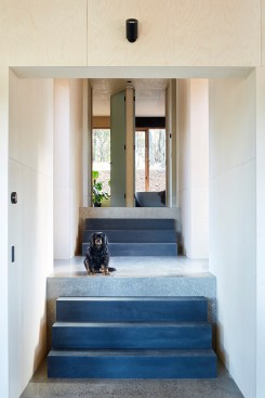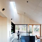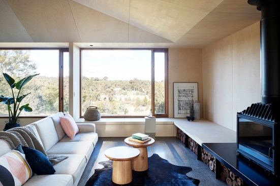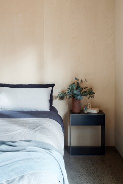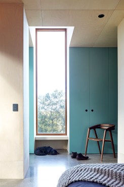 Located in the adjoining pavilion are the bedrooms and bathrooms. A series of cellular spaces that are minimal in nature, yet intimate and cosy. “Where the public zones are open-plan and outward facing, the bedroom and bathing quarters are designed to be compartmentalised and private. It also reveals something of the clients, in that they value time spent together and were looking to create a living environment which was at once sociable and welcoming, while also offering solace and seclusion,” said Moloney. In designing the interiors, Moloney Architects has applied a uniform birch-faced plywood finish throughout. Warm and tactile to touch, the singular use of plywood reinforces the monolithic form of the interior’s angled ceilings. “It’s an important form gesture that expresses the sculptural nature of the interior architecture, and accentuates the warm heart of the space,” said Moloney. The result is a textural interior that exists as a sculptural expression in its own right.