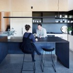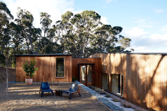 The resulting Two Halves design addresses these dual requirements by simultaneously dividing and connecting; separating the ‘public’ open-plan living zone from the privacy and quiet seclusion of its neighbouring sleeping and bathing quarters. “The two pavilions essentially distinguish the functions of the house, splitting the public and private zones to give the main living spaces the best views and natural light access,” said Moloney. Forming the centre of the open living zone is the kitchen with connecting ‘conversation space’ – a communal zone designed for milling and conversing while still feeling a part of the kitchen action. “This space is an extension of a friendly catch-up sitting on stools in the kitchen. We wanted to promote that encounter and extend it beyond the island bench” said Moloney. Heightening that connection between the kitchen, living and dining spaces is a purpose-built, low-set bench seat that runs around the room. Guests and inhabitants alike have numerous opportunities for intimate chats and casual, comfortable sit-downs.