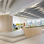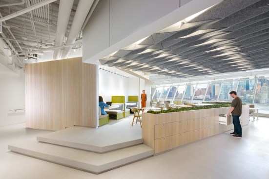 The team developed the concept of ‘Tech Ethereal’ as a testing ground for future agile workspaces. A crisp, elevated take on tech interiors is emphasized with a palette of earth tones and bright organic colors that play off of Two Sigma’s branding. Chartreuse upholstery contrasts mottled cork in the conference rooms while a trough of Irish Moss embellishes the white oak central gathering platform. Natural daylight floods into the Collision Lab through floor-to-ceiling glass windows presenting a striking tableau of midtown Manhattan and yielding transparency from the Cornell Tech campus below.