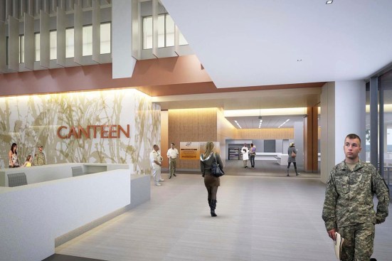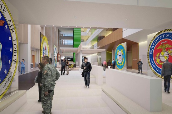 The architecture of the new medical center integrates a focus on sustainability, relationships to nature, and symbolism intrinsic to military life. The facades of the medical center feature vertical patterning of metal panels and curtainwall, inspired by the colorful regalia of military ribbons, while horizontal striations reference the similar natural layering of limestone found in the surrounding Kentucky hills. The concourse and gardens are divided into four areas representing the milestones of a veteran’s service: join, bond, honor, and thank. The pair of parking structures are screened in copper-colored bowed and wire mesh panels, which frame a perforated screen emblazoned with a patriotic theme.