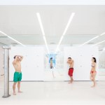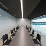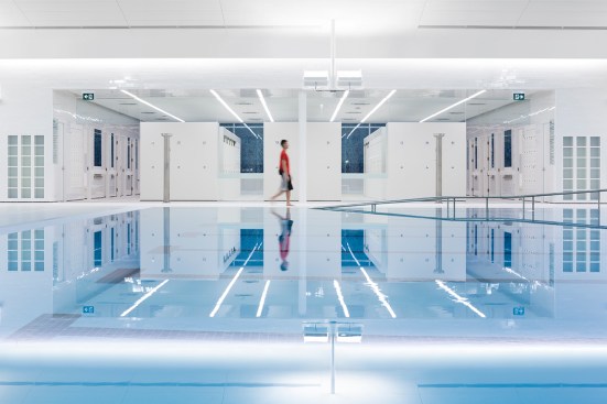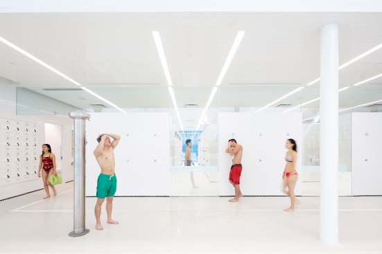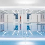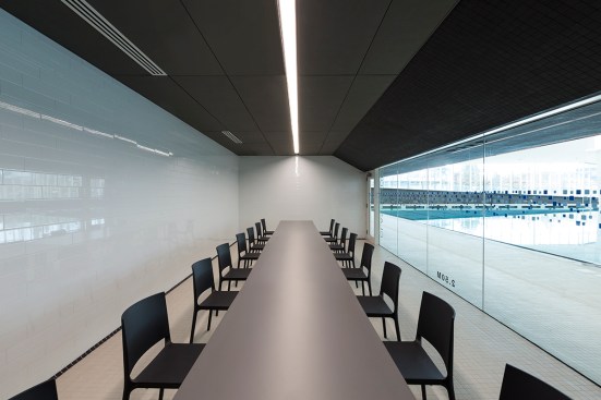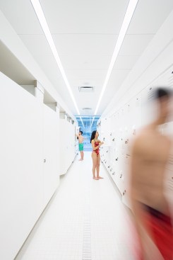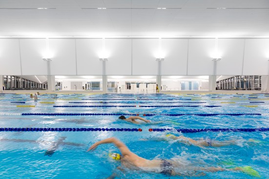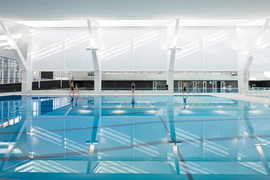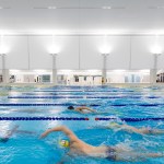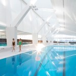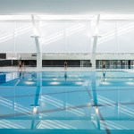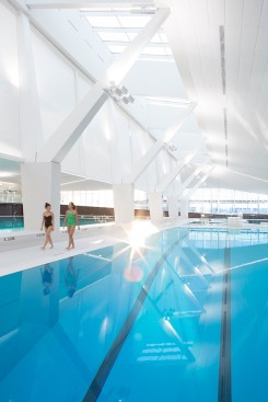 The requirement to co-program elite level training and competitions with daily community use led to a 2-sided pool hall divided by a ‘Y’ shaped columns and a continuous skylight bisecting the building. In section, a translucent screen creates a luminous barrier between the two spaces, reflecting abundant sunlight into the ‘leisure’ side, while providing the required controlled and balanced light into the ‘competitive’ side.
