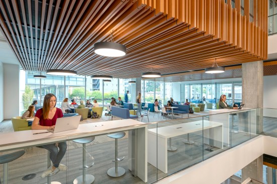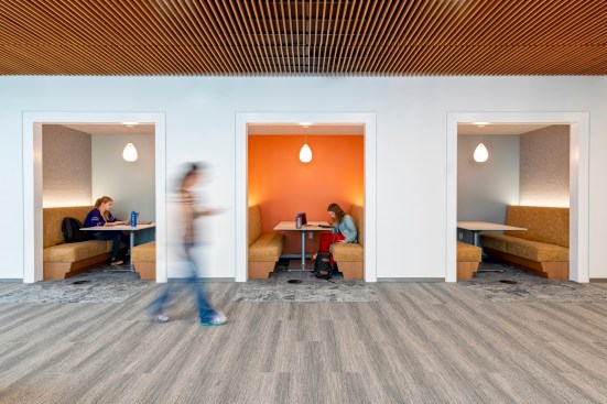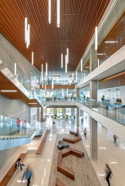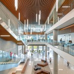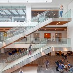 Activated by the public realm, the lower forum of the multi-level atrium connects city street to university plaza with circulation, retail, and informal social spaces, inside and out. In contrast, the light and airy upper forum cues the privacy needed for focused work and study with skylights that flood the terrazzo interior with indirect light. With ample break out areas, the forums offer a stand-in for the campus quads for which the site did not have space. It was important to UC Berkeley that the three different academic departments be equally represented, with their particular identities integrated into the architecture. The multi-level atria helps make evident each department’s identity as part of the fabric of the interior space. The culture of each department is expressed by exposing collaborative, public program elements—meeting spaces, certain offices, and learning environments—to the atrium, while private functions move to the building perimeter. Signage and a vibrant paint palette further distinguish each group.