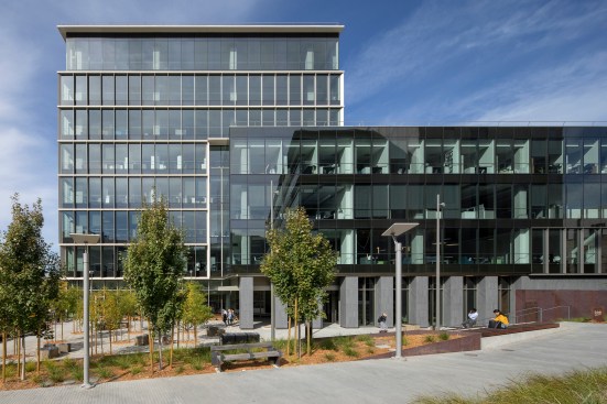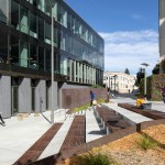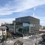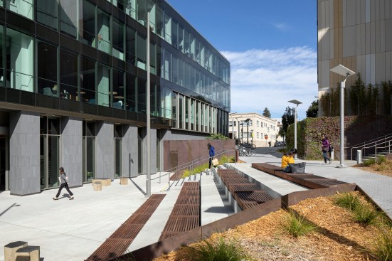 Located on a tight urban site at the edge of campus, Berkeley Way West is expressed as two interlocking L’s that create a stacked forum, or two distinct, multi-level atrium spaces around which the building is massed and the program is oriented. This strategy creates a social heart for the building, optimizes buildable square footage, pulls in natural light, and responds to both the urban and campus conditions. Weighted towards a major commercial artery directly to the west, the larger mass rises to eight stories and picks up on the life of the street with ground floor retail and storefront vitrines topped by offices that look out onto the city. The lower massing, containing academic classrooms and departmental offices, steps down towards a midblock walkway, pedestrian plaza, and garden that connect to UC Berkeley’s campus to the east. Corten steel, raw concrete, and a light, glassy façade articulated with aluminum fins further distinguish Berkeley Way West as a building that is both of its campus and its city.