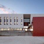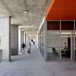 The Arts and Computational Science Building is massed and oriented for optimal energy efficiency and comfort within the context of Merced’s often hot climate. Long and thin, it is oriented along an east/west axis and expressed as a perforated bar intersected by a colorful volume, the auditorium, that welcomes the campus community. A shaded walkway or paseo, creates a procession through the building from the hardscaped quad to the natural landscape of an adjacent meadow, while addressing a significant grade change. A simple materials palette of concrete, cement plaster, glass, and metal panels help the building relate to its new neighbors while allowing for a distinct aesthetic expression.