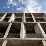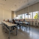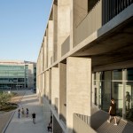 A hearth and connector, the Arts and Computational Sciences Building interprets the Live/Learn motif on its site and within the campus. The building links a new academic quad with future housing and extends a primary circulation path through the existing and new parts of the campus. A brise-soleil, with angled cast-in-place concrete columns, runs along the south side of the building, offering students an outdoor, sheltered gathering space and comfortable transition from the quad to the interior. More active programs, including art studios and the lecture hall, are located on the ground floor, adding vibrancy along the brise-soleil and quad and encouraging interaction between students, faculty, and staff. As a shading device that is sculptural, the brise-soleil extends to the upper floors as the building’s primary circulation, supporting building efficiency and promoting wellness.