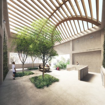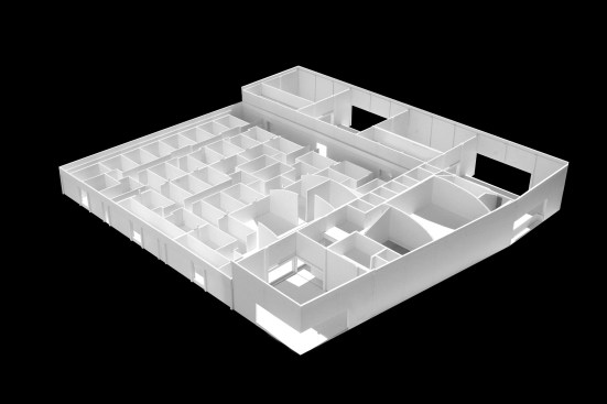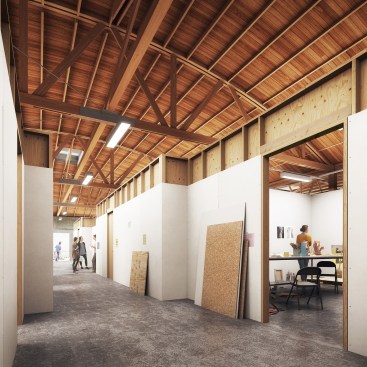 Studios are clustered in small blocks in the renovated warehouse, and, throughout the complex, circulation mimics a neighborhood map writ small: entries and infrastructure on cul-de-sacs and plaza-like spaces for larger gatherings, all connected by criss-crossing pathways akin to streets. This new city within a city rendered from deftly elevated industrial materials is a fitting space to inspire future artists, and an apposite addition to the neighborhood.