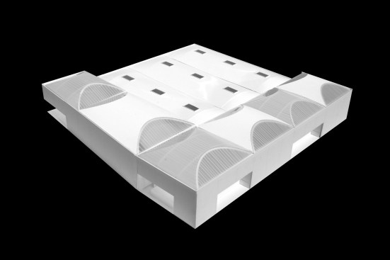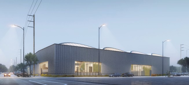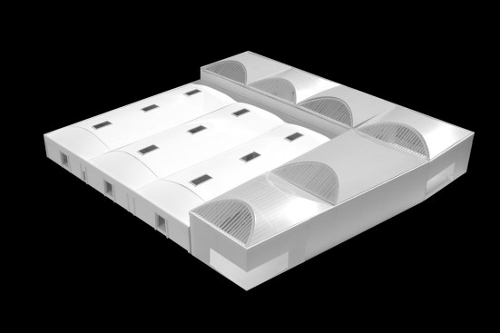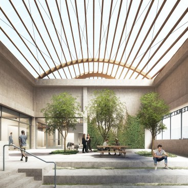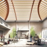 Made from site-cast, pillowed, tilt-up concrete façade panels that nod to warehouse construction but elevate it with a lush, almost textile-like finish, the addition houses classrooms and lab space for everything from woodworking to ceramics. It is topped by a grid of vaults—lined with curved glulam beams and covered in either roofing membrane or curved polycarbonate—that recall the bow-truss roof on the old warehouse; some will feature the beams only, to allow for plein-air studios.