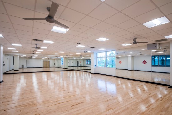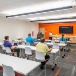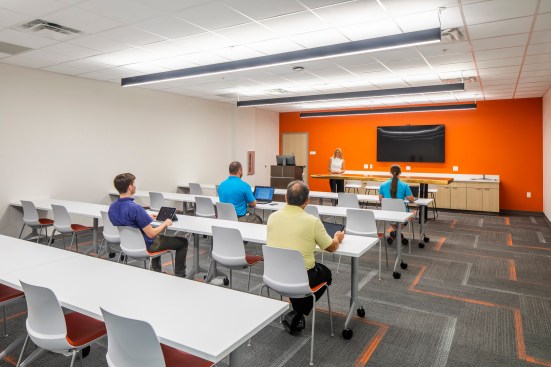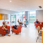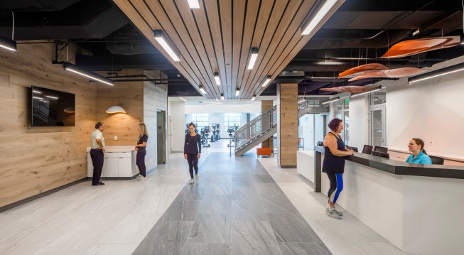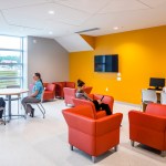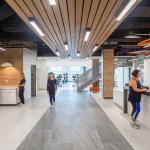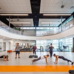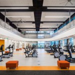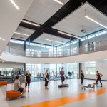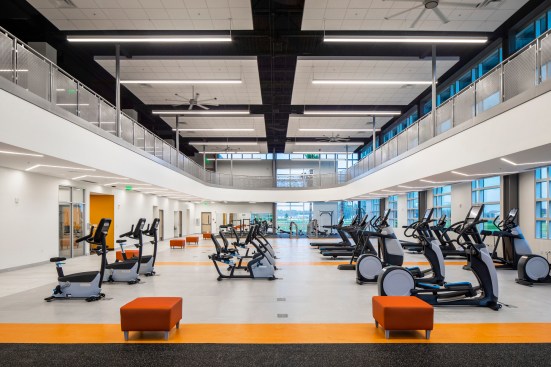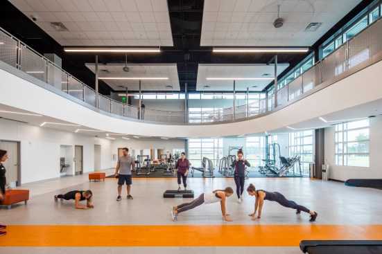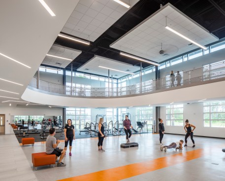 A state-of-the-art YMCA features increased pops of orange to evoke energy throughout the space, and resin ceiling petals and distinctive floor patterns provide intuitive wayfinding throughout the building. The first floor houses cardio and strength equipment, with each exercise space denoted by changes in flooring type and color, and is overlooked by a running track on the second floor. Dedicated workout studios provide space for group exercise classes, and a “kidzone” with indoor and outdoor play space allows children to explore, play and learn while parents workout. The connected healthy living center is designed to host educational programming, with a dedicated classroom for teaching community members about making healthier choices, reducing chronic disease and reclaiming good health.