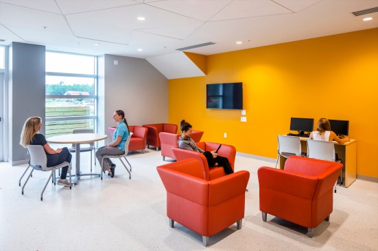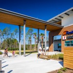 The building’s distinctive exterior is cohesive with the development’s other buildings, with a “Florida Lowcountry” architecture that embraces the North Florida habitat and lifestyle. The wood-look rainscreen on the building’s exterior wraps into the lobby, and board and batten walls and wood slat ceilings also carry through from the exterior. Wall-mounted lighting in the main concourse is reminiscent of fireflies, one of the community’s motifs for the monumental signage, and create a playful connection to nature.