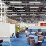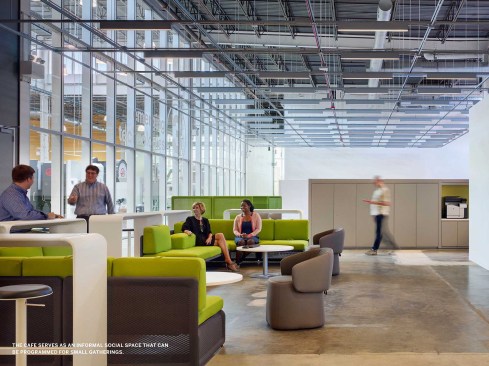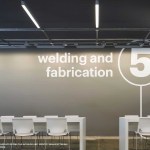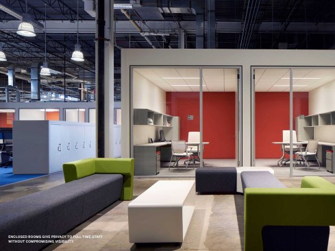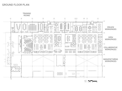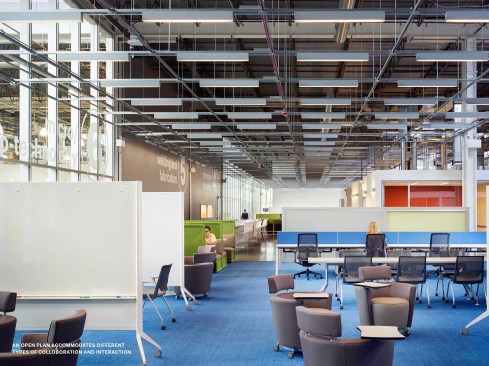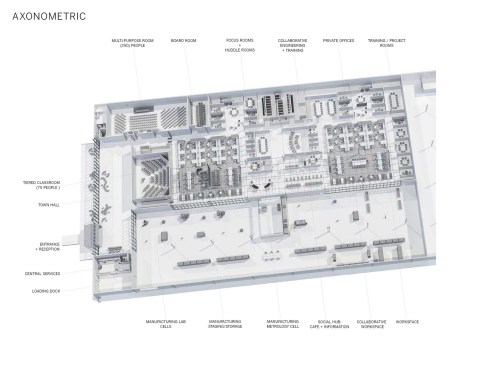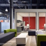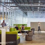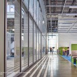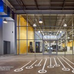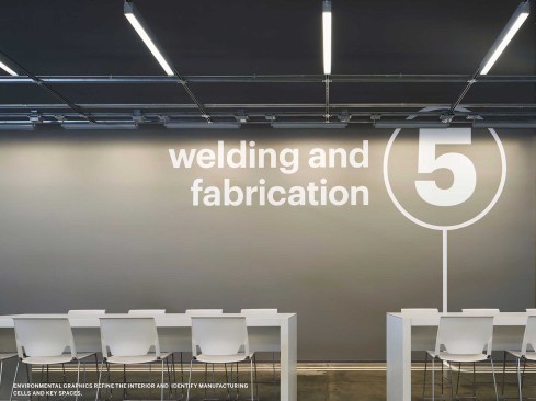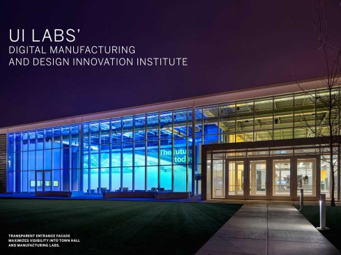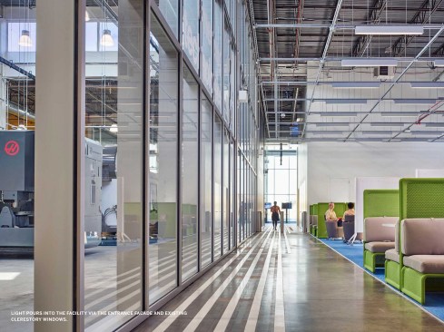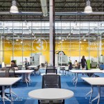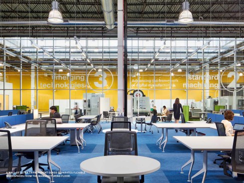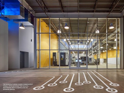 Located on Chicago’s Goose Island, UI Labs’ Digital Manufacturing and Design Innovation Institute is the first lab of its kind in the U.S., enabling side-by-side collaboration as university and industry partners reinvent 21st century manufacturing. Flexibility and visual connectivity underpin the design of the 64,000 SF facility. Visitors step into a double-height “town hall” open atrium that leads to a state-of-the-art classroom and a multi-purpose room, which have been equipped with the technology that supports off-site collaboration. Behind the town hall lies a 22,400 SF digital manufacturing floor, collaborative engineering space, two open workspaces, a café, staff offices, and meeting rooms. A wall of ultra-transparent glass separates the manufacturing floor from the open workspaces, making activity visible and helping to diffuse daylight from the existing clerestory skylights deep into the facility. Workspaces accommodate a variety of densities and furnishings to foster collaboration, make spatial re-programming simple, and keep sightlines clear. An environmental graphics suite brings further cohesion, information, and inspiration to the interior. Prominent elements include a large-scale magnetic storyboard wall; two sculptural pieces that display the names of UI Labs’ partner institutions; and wayfinding white stripes, painted on the concrete floor, that lead to different spaces within the facility.