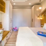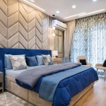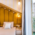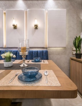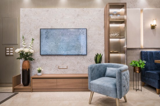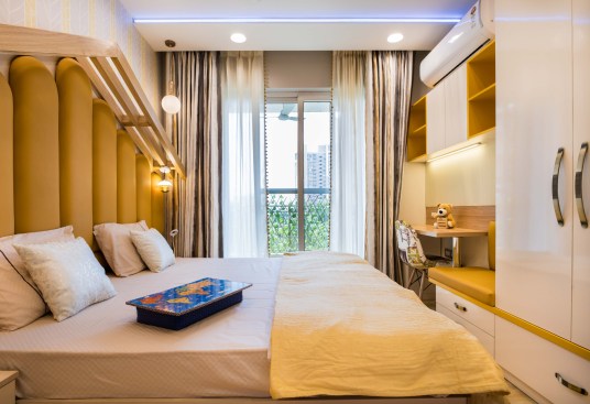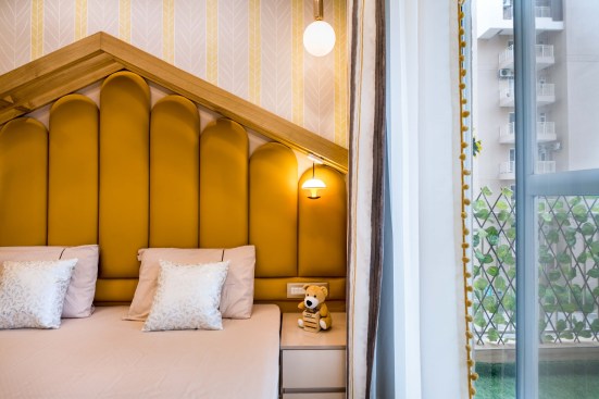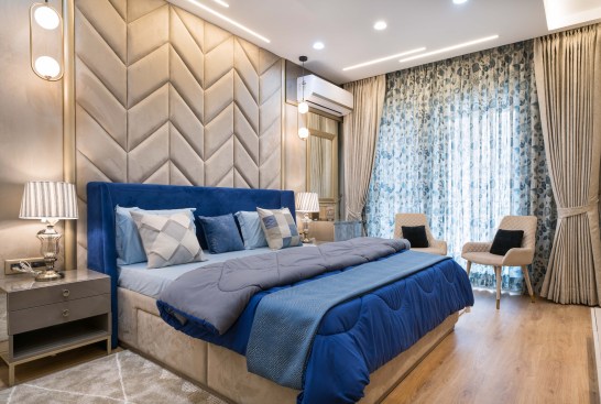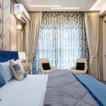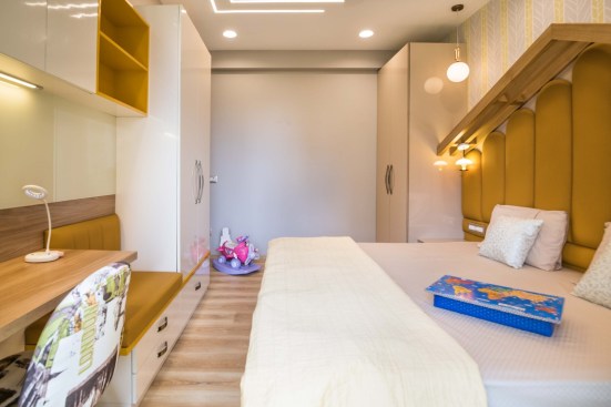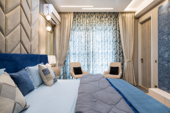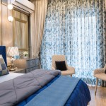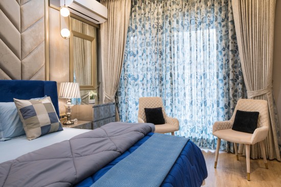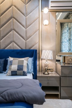 Light and colour play an essential role in this house. The crux of the purpose of this house lies in creating a break from the everyday lives of the occupants. The house needed to reflect a sense of temporary detachment. With bright colours and curated lighting, the architects could balance a sense of plush and earthiness in the house’s decor. Blue played a vital role in the interiors. Highlights of this colour can be noticed either on the carpets or on the furniture or even drapes. A dash of colours like mauve, beige and coral balances the monotony. The master bedroom has an extent of mauve matched with blue chairs and a beige wall finish. A sunflower theme inspired the kids’ bedroom; there is a mix of bright yellow and beige on the upholstery, furniture, and decorative elements. The coral couch in the living room makes a bold statement of colour, subduing the pastel blue and beige wall finishes. The flooring made of pre laminated wood in certain areas and italian marble in others, suits well with the furniture and wall finishes. With both ambient and accent lights, high lux levels highlight these colours and give meaning to them whilst positively and collaterally impacting the occupants’ minds.