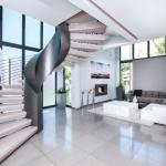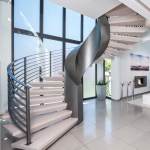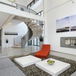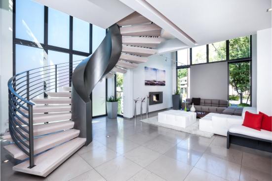One of the primary design statements within the space is a stunning winding staircase. Maydan says she designed the staircase first, and based the design of the rest of the house around it. Working with a very narrow and long lot, it was a challenge to create a beautiful entry. That’s how the idea of the striking staircase was born. She added a floor-to-ceiling frosted curtain glass wall behind the stairs in order to allow light to come in, while blocking the neighbors from view. Additionally, the home includes a first-floor office space and a family room that can also function as a media room, merely by dropping a 110” screen from the ceiling.