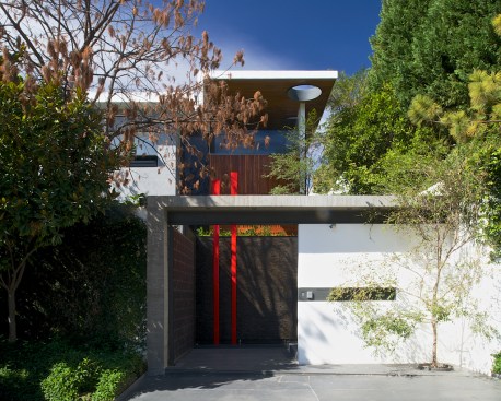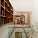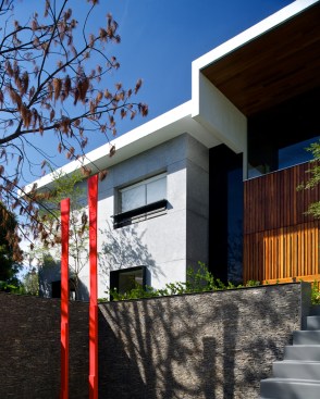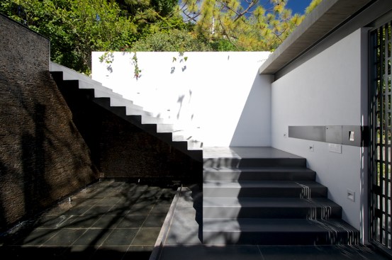 Although, typically we tend to understand a project’s emplacement as a question concerning which part of a given site is chosen to build on, in this particular case, the decision had to do with a vertical rather than a horizontal concern. In this sense, a key to understanding the project is to notice that its ground floor is not on the street level, but one level above it. This solution provides two noticeable consequences: first, most of the noise that comes from cars is eliminated, and secondly and most relevant, instead of looking directly into the street, all the views from the house’s ground floor look towards the tree tops from the surroundings, in a way, erasing its urban context.
