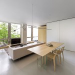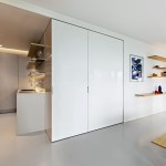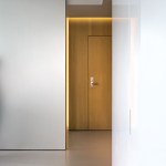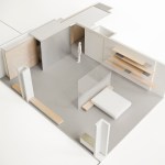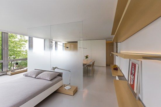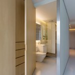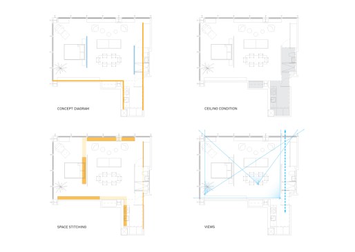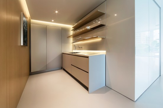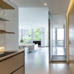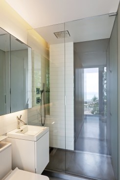 The renovation of this lower floor apartment began with a clear intent, to achieve unobstructed views towards the lake from all vantage points within the unit. First, the sleeping and living arrangements were re-configured and separated with a floor to ceiling glass wall. The inherent properties of the material enables one to see the lake at any given time, either in the reflection or directly through. The applied gradient pattern in the glass adds a sense of privacy within this fully open plan. To further maintain the sight lines, we hid the large living clutter, integrating it within the perimeter demising zones. Behind what appears as a continuous wood wall, an abundance of storage space is allocated, while the floating shelves and low profile millwork add a sense cohesive stitching between the various living zones. Even in the selection of the furnishings we tried to keep the views clear choosing elements that are not opaque or solid. In the kitchen, the deepest and darkest area of the apartment we borrowed natural daylight through the bathroom space, by creating a direct aperture towards the lake through the layers of “smart” glass enclosure in the shower wall. As a result, we achieved our initial intent, while paying subtle tribute to the building’s refined clarity and to its architecture master of less is more.