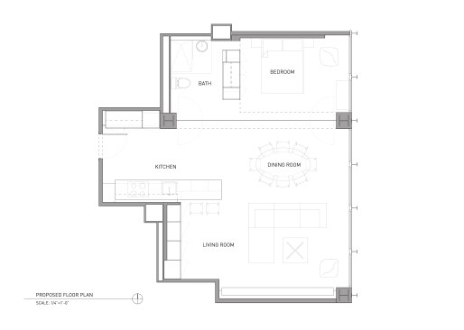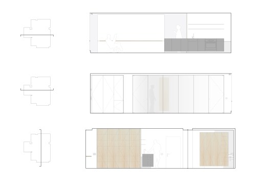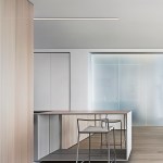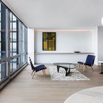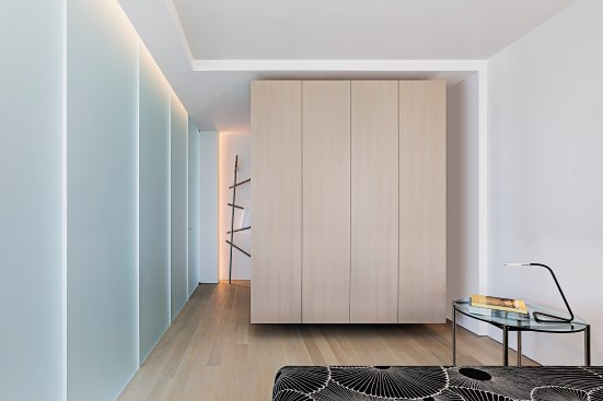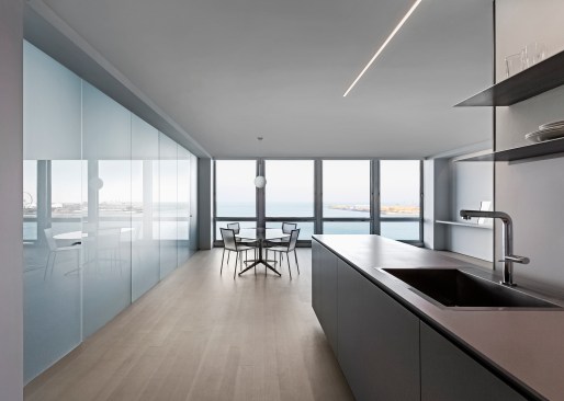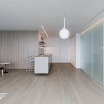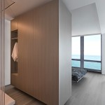 Within this iconic high-rise unit, our clients imagined their second home with few boundaries between them and the exterior breathtaking views. By removing all of the opaque walls and introducing an architectural language of floating volumes and space-defining planes, we created the desired spatial experiences that did not previously exist. At the entry, while drawing direct connections with the lake, we added an open kitchen creating a multi-functional space. To the right, the carefully placed floating mass welcomes you, gesturing towards the main room. As it extends deeper into the living space, a reading nook is formed at the back of the projection, offering a sense of refuge inside of an open plan. When sitting, this projected element transforms, reflecting the adjacent spaces within its carved niche. The integration of a seemingly continuous glass plane provides privacy between the two primary living zones. However, its true function is to create a backdrop of illusion, capturing the expansiveness of the exterior, as well as the dynamic mood changes of the Great Lake. In re-orienting the plumbing-dependent elements of both the kitchen and bath towards the lake, we physically and visually connected them with adjacently shared zones. Now, one can admire the sunrise while showering and absorbing the horizontal morning light. While placing emphasis on the refined expression of the building’s minimalist tradition, a quiet living space is formed for contemplation and refuge in the sky.