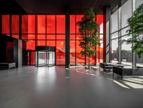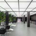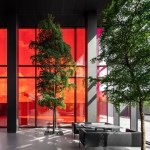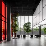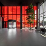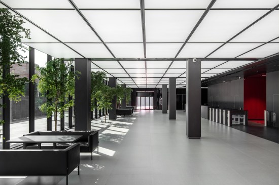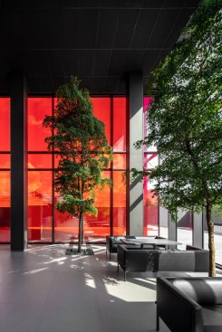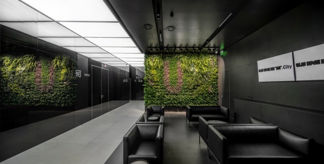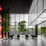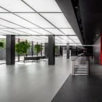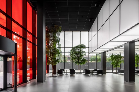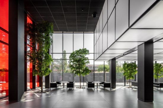 Landscaping the space came up as another interesting solution. Living trees are planted around the perimeter of the premises, and a green wall is equipped in the lounge area. Since the main colors of the project are monochrome (various shades of gray) with the addition of red, green spaces add coziness and friendliness to the space, without blurring the general design concept – minimalism, environmental friendliness and freedom.