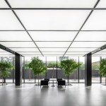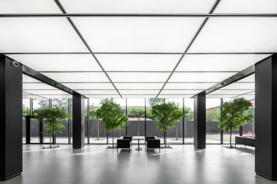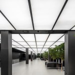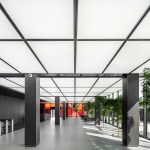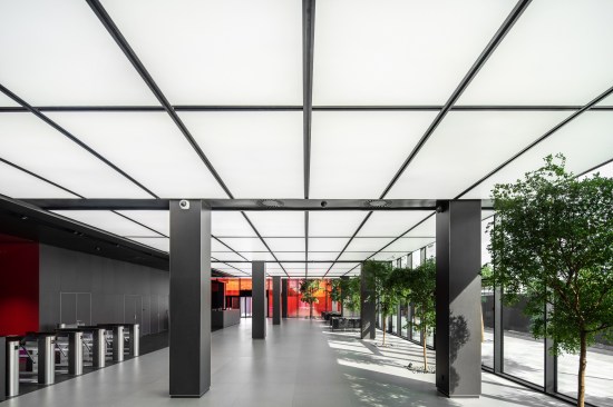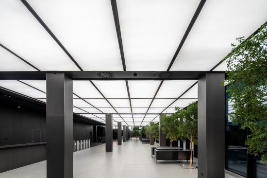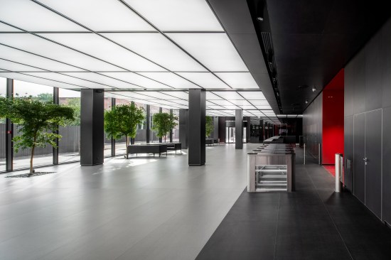 In case natural light is not enough, the campus is equipped with an unusual lighting system: it is hidden behind a frosted glass ceiling. The brightness is adjusted with a dimmer, so the needed lighting intensity can be chosen depending on the time of day. All glass segments of the ceiling are removable, which simplifies the usage and maintenance of the system.