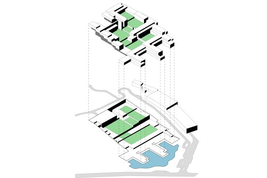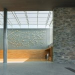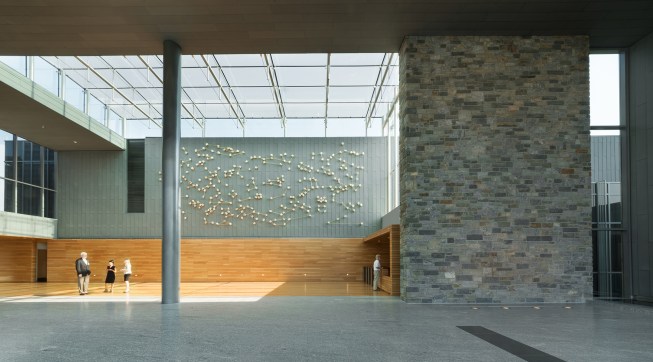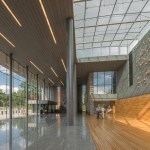 Because of the excavation required to work the massive square footage into the sloped site, the design team also had to think about water circulation to keep flooding at bay, devising a system that pumps groundwater from the foundation drains back to the aquifer. The base of the site is anchored by a pond, keeping the institution’s nautical sensibility at hand.