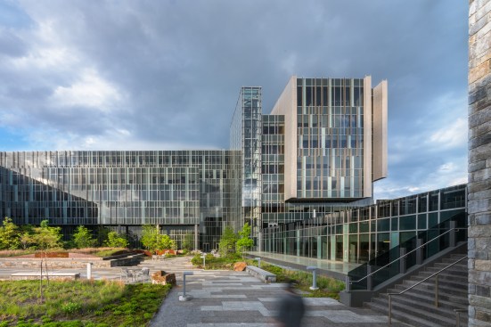 The structure’s narrow wings and its perimeter brick walls echo the form and material of the nearby St. Elizabeths Hospital. But the cladding facing away from the campus toward the green roofs, courtyards, and views of the D.C. skyline has a much different character: glass curtainwalls, with irregular patterns of mullions and green spandrel panels that echo the foliage of the surrounding landscape.
