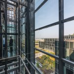 Entered at the top of the hill—through a zinc- and stone-clad portal—the building has a bank of glass-walled elevators that connect all 10 floors. A circulation spine links this entrance to the furthest wings at the bottom of the slope, making it easy to navigate what otherwise looks like a complicated plan.