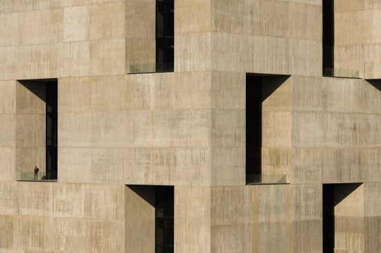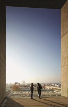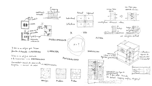 Santiago’s climate requires to change the conventional approach to working space design. We substituted the contemporary typical glass skin, responsible for serious greenhouse effect in interiors, for a thermal mass on the perimeter that avoids undesired heat gains. On the other hand, innovation and knowledge creation requires increasing encounters among people, so openness is desired. We multiplied open air squares throughout the building’s entire height and proposed a permeable atrium core so that while circulating vertically, people could see what others are doing. This reversed placement of opaqueness and transparency is the way sustainability and human relationships informed the form.
