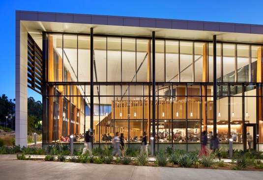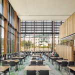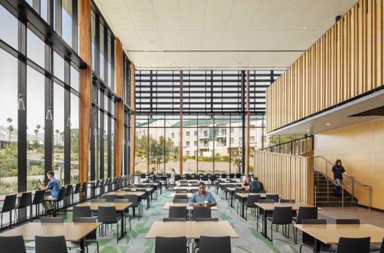 At the courtyard’s southern reach, a large portal through Dundee South Hall reveals the 800+-seat Glasgow Dining Commons, the residential precinct’s signature building. Sweeping walls of glazed curtain wall are shrouded within a louvered shell, allowing for dramatic views of the surrounding Box Spring Mountains, while mitigating solar gain and glare. The 52,000 square-foot all-you-care-to-eat facility offers six unique food venues, including a central demonstration kitchen and exhibition bakery, as well as a grab-and-go convenience store. An elevated outdoor dining terrace provides additional seating, taking advantage of the campus’ hospitable climate, year-round. Glasgow Commons is LEED Silver.