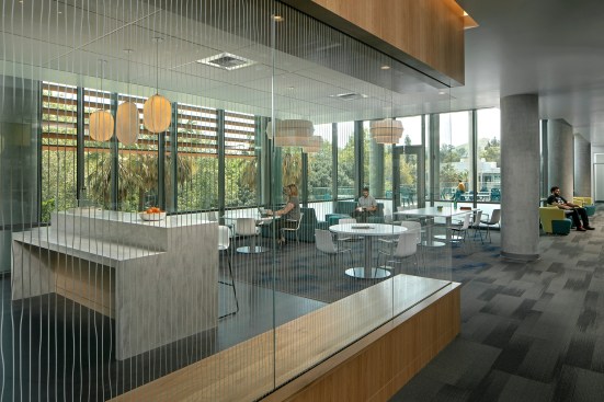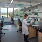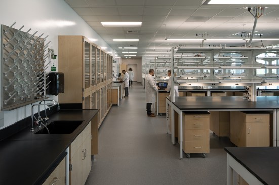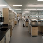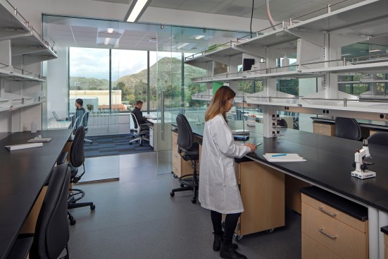 The design carefully balances the exacting requirements for each research environment, while also fostering collaboration. Spaces transition from focused research and equipment areas in the building’s interior, to more flexible, open labs as one moves outward to the building’s perimeter. Glass walls and sliding doors provide necessary separation of research areas while allowing for visual connections within the laboratory environment.