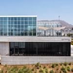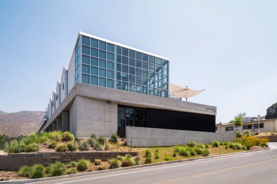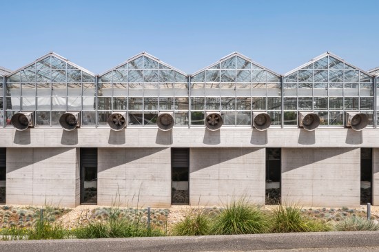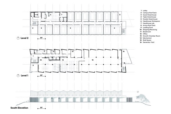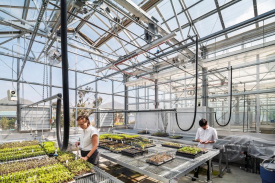 A compact cluster of 16 greenhouse modules sits on the second level of the research facility atop a concrete-wrapped ground level. The ground level includes a workroom for potting plants and other activities, a room for growth chambers, and other amenities, including a lobby, breakroom, and restrooms. The serrated concrete wall that envelops the lower-level acts as a thermal mass that stabilizes swings in internal temperature, reducing the need for mechanical air conditioning and capitalizing on the Southern California climate.