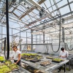 Each upper-level greenhouse is encased in double-pane polarized glass, the transparency of which reveals the research activities taking place within. Humidity, temperature, lighting, and other conditions can be independently calibrated in each module to mimic a diverse range of conditions. Climate control is assisted through vertical and horizontal automated shades that enable researchers to closely tune the natural light, adding another layer of customization. Air-conditioning stabilizes select areas, but an evaporative cooling system covers the whole building, allowing it to maintain temperatures lower than other research greenhouses on the campus.