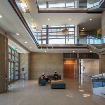 Envisioned as a hub, or “collision-space,” for the scientific community at UCSB, the site anchors the intersection of two primary campus circulation routes and is centrally placed within the science and engineering district. Initiated through an extensive programming phase, the design embraces its important site while providing three floors of interdisciplinary research labs anchored by a three-level atrium and 100-seat auditorium