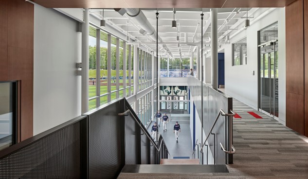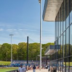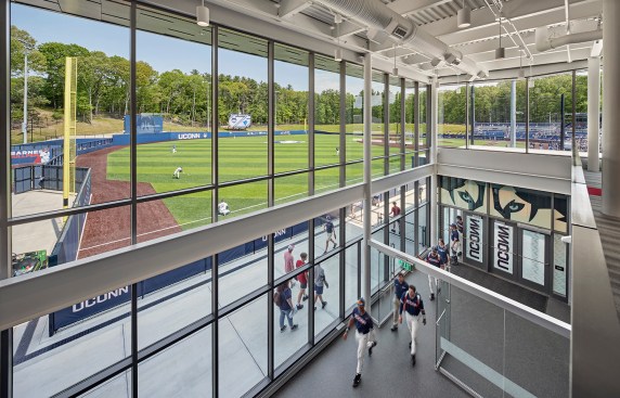 The new Athletic District creates a tremendous asset in recruiting and retaining top student-athletes and showcasing UCONN’s programs to the Big East conference and the nation. The new Rizza Performance Center–a resource for all athletes on campus–houses team support facilities including locker rooms, strength and conditioning, batting cages, hydro-therapy pools, and gathering spaces. Coaches’ offices overlook the fields as inspiration for staff, athletes, and recruits. A broadcast control center on the upper level can transmit events live from numerous sports facilities on campus.