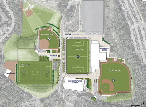 The University of Connecticut Athletic District Development transforms an underutilized campus edge site into a new, national-caliber district for multiple sports. The scope includes four new venues–Elliot Ballpark (Baseball), Burrill Family Field at the Connecticut Softball Complex, Joseph J. Morrone Stadium (Soccer), and a Practice Field–and the Rizza Performance Center at the core of the new district, as well as the replacing, re-routing, increasing capacity, and providing the new utilities necessary to support the athletic district development and other parts of campus.