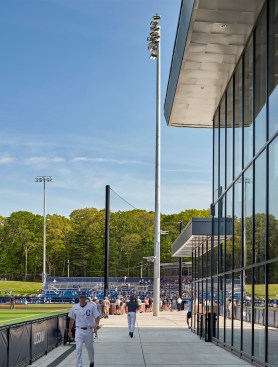 To realize the project over a period of four years from master planning to completion, the team overcame major challenges relating to site, budget, sustainability, and coordination. The site of the existing district, located on the south edge of campus adjacent to wetlands and a residential neighborhood, housed a baseball and softball competition field with no lighting, no turf, and grading issues. As the project progressed, our team uncovered major geotechnical challenges resulting from contaminated soils dumped on site from decades of previous construction projects. To keep these challenges from derailing the project and consuming the budget, we moved the location of the performance center to avoid the worst soil conditions. Geo-piers stabilized the soil to enable building. Rather than carting soil off-site, which would have been prohibitively expensive, we reused the less contaminated soils to create grassy knolls that serve as seating berms for baseball and softball game days. Working together, the team was able to achieve LEED Certification for the district despite the drawbacks of the site.