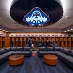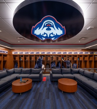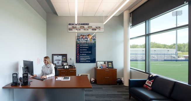 In interior spaces, all furniture and finishes meet or exceed LEED requirements. Natural wood, carpet, quartz countertops, and faux leather furniture in the convey a club-like atmosphere in the Performance Center’s offices, meeting areas, and locker rooms. Rubber flooring doubles as a sustainable choice that also provides the durability to withstand cleats. The district’s facilities are universally accessible, including all spaces in the Performance Center. A comprehensive branding program makes the spaces uniquely UCONN.