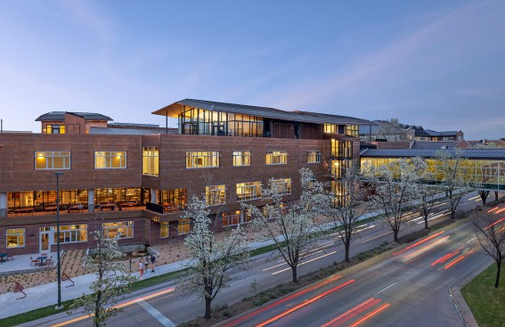 The Community Commons sets high sustainable design goals and engaged the DU community to integrate environmental and health and wellness strategies into the design. Providing equitable access to daylight is achieved through a north-facing clerestory that spans the entire building length to leverage Denver’s 300 annual days of sunshine. Individual well-being is further enhanced thru social stairs along the flow path, operable windows, individual control, and outdoor terraces and gardens that connect to nature and enrich social interactions. Anti-microbial, locally sourced, exterior copper cladding connects the building to the region. Responsive planning and high-performance building systems reduce energy use by 49%.