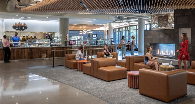 The University of Denver’s (DU) new Community Commons welcomes a diverse student community by bringing a critical mass of students and resources to the center of campus—a primary goal of the University’s strategic plan. Since opening in 2021, the project funnels and mixes students capturing movement to and from the new first-year housing, with a variety of gathering and working spaces for students, faculty, staff and visitors to dine, meet, socialize, study, and make use of the school’s supportive services.
