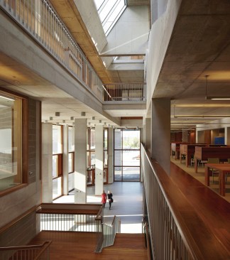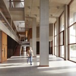 The undercroft of the residences is carved away providing archways allowing pedestrian movement from the carpark and bus park to the north as well as forming sheltered social spaces for students. Large gateways open into the entrance courts of the housing blocks.