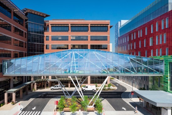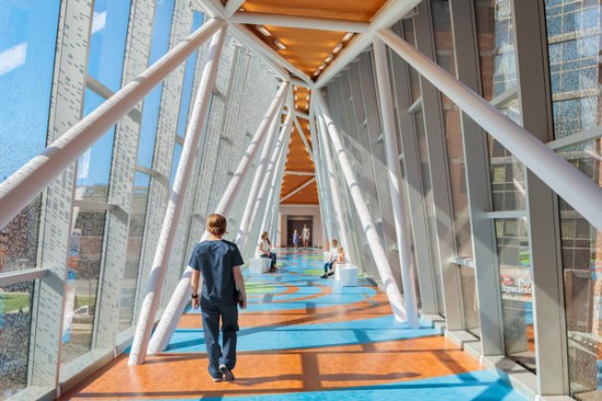 A BRIDGE LIKE NO OTHER HELPS REDUCE ANXIETY FOR CHILDREN AND FAMILIES AS THEY APPROACH A NEW MEDICAL OFFICE BUILDING AT THE UNIVERSITY OF LOUISVILLE PHYSICIANS.