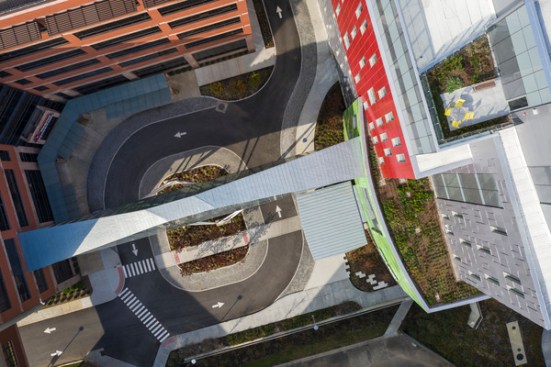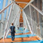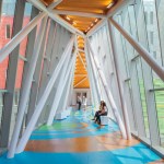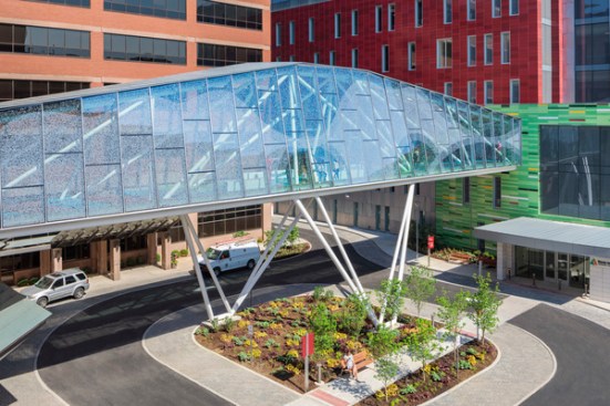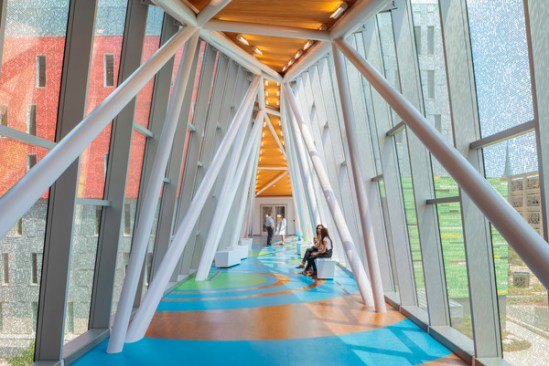 The soaring roof height allows everybody to experience a child-like sense of wonder. All who cross can contemplate the connection between architecture, engineering, and sculpture…or just have fun. Either way, the bridge helps ease anxiety through positive distraction as children and families approach the Novak Center for Children’s Health at the University of Louisville Physicians.