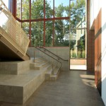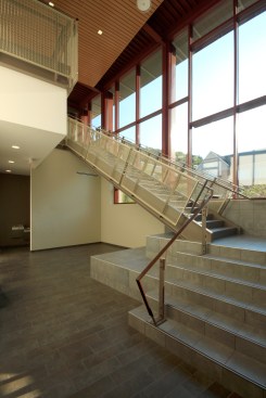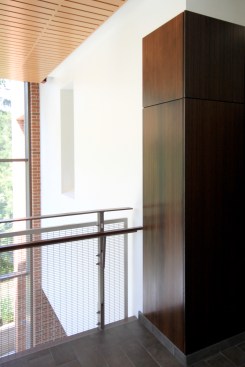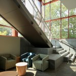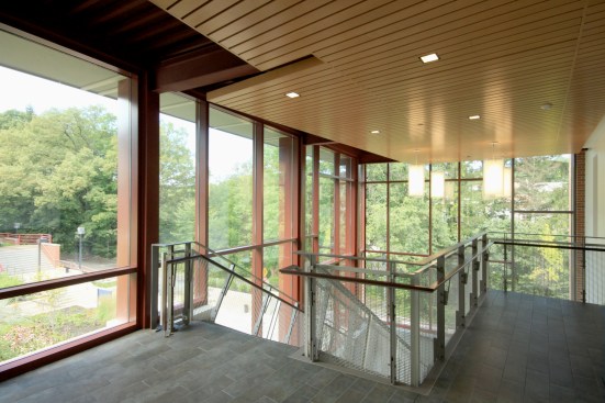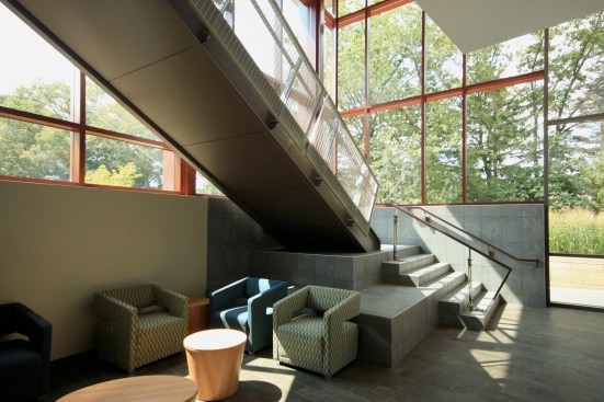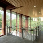 Enclosed in glass, the building’s main internal stairway allows for an expansive view of the surrounding woods and stream. Metal mesh infill panels in a custom angle iron frame, both manufactured by Banker Wire, form a semi-transparent stairway railing that complements the space’s glass façade. The railing’s transparency was an especially important feature, as the designers wanted the outdoors to be visible from all of the occupied spaces within the building. The Banker Wire infill panels and angle iron frame were also used on the building’s exterior ramp and plaza, where they allow for the uninterrupted transmission of natural light into the building.